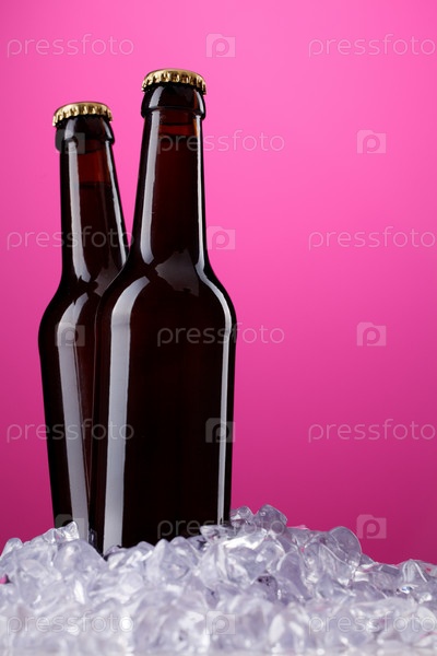 Две бутылки пива на розовом фоне