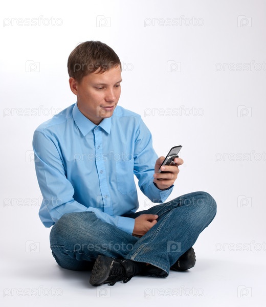 Молодой человек держит свой мобильный телефон
