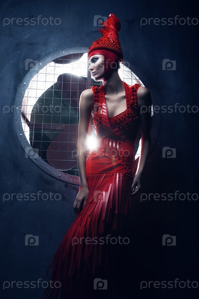 Женщина в красном на фоне пропеллера