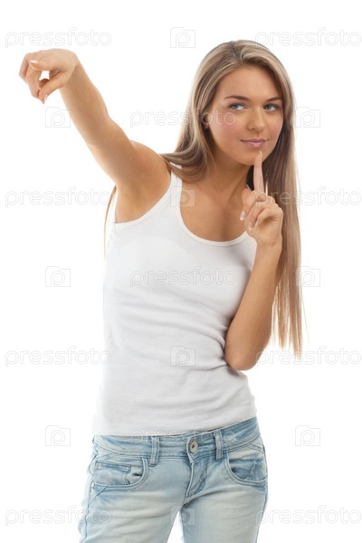 Портрет красивой девушки, указывающей на что-то. Изолировано на белом фоне