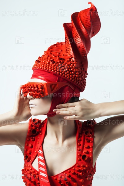 Женщина в красном платье в белом интерьере