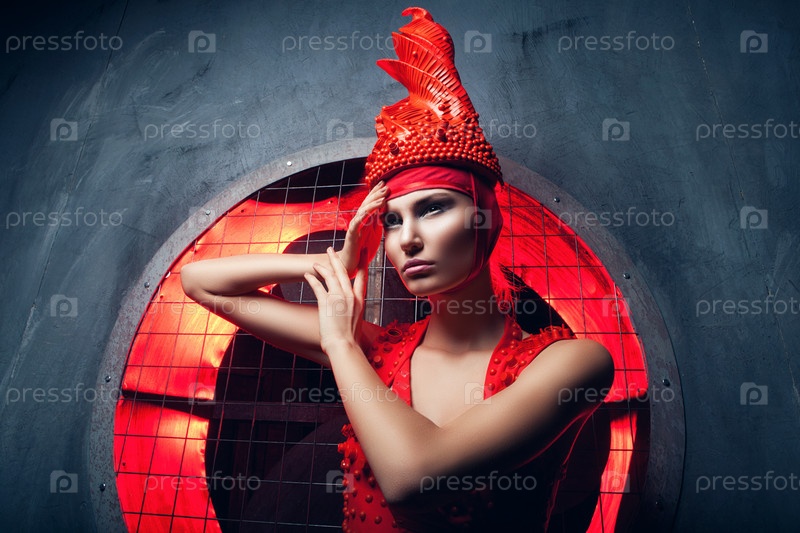 Женщина в красном платье в круге красного света