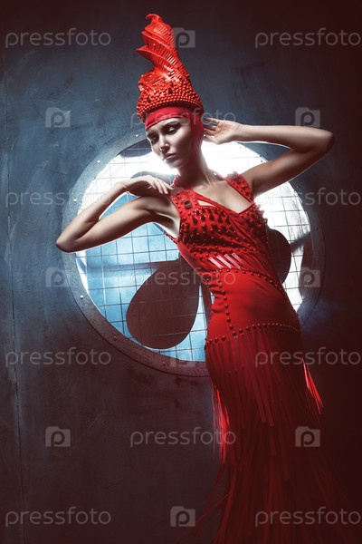 Модель в красном платье и шляпе