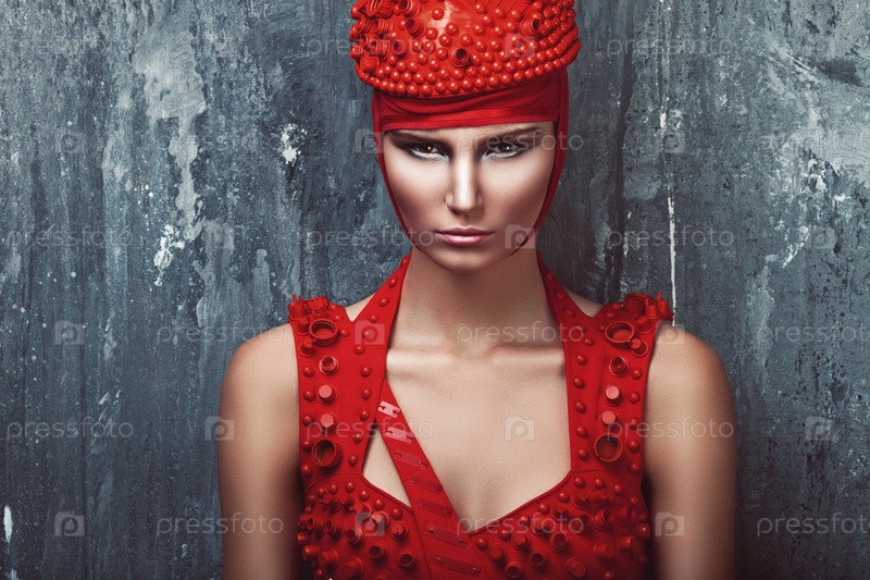 Модель в красном платье и шляпе