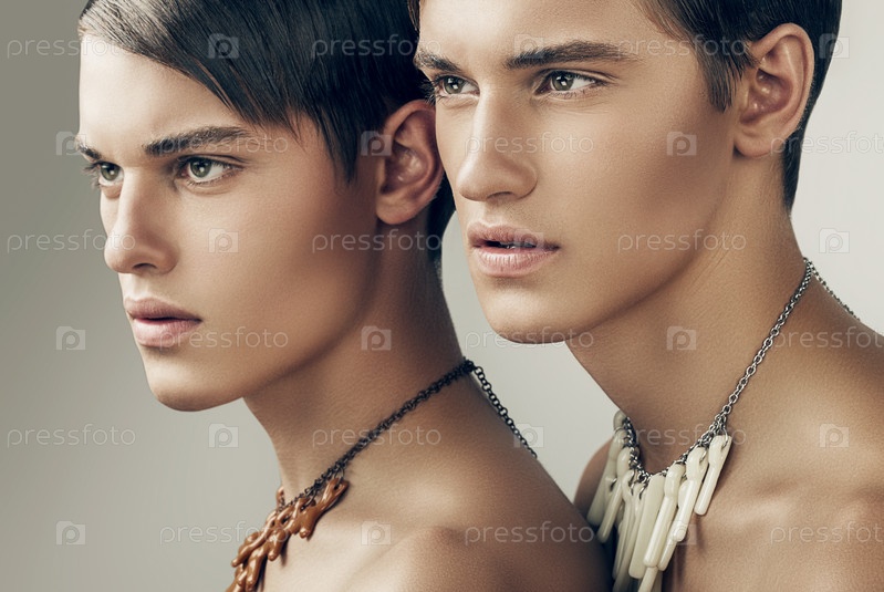 Двое мужчин-моделей на сером фоне