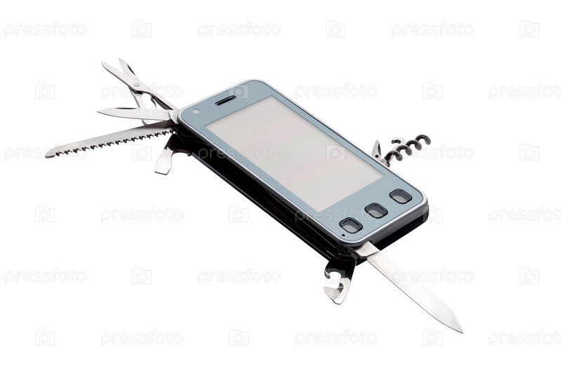 Многофункциональный телефон-перочинный нож, изолирован на белом фоне