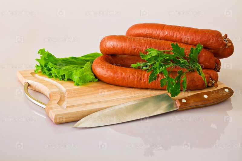 Копченая колбаса, зелень и нож на разделочной доске