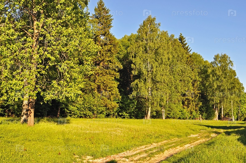 Проселочная дорога в лесу, летний солнечный вечер