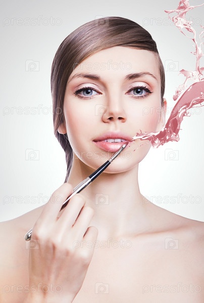 Женщина с кистью для нанесения помады и всплеском краски