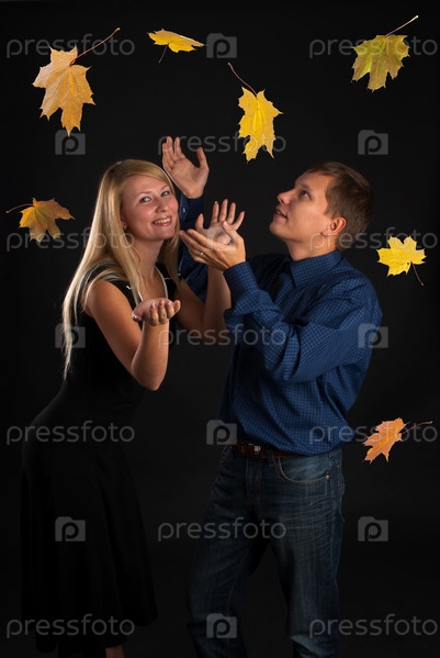 Красивая женщина, мужчина и кленовые листья