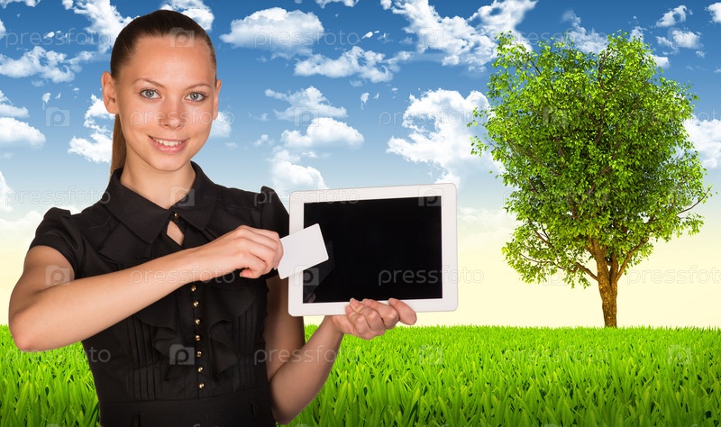 Бизнес-леди с планшетом и визиткой