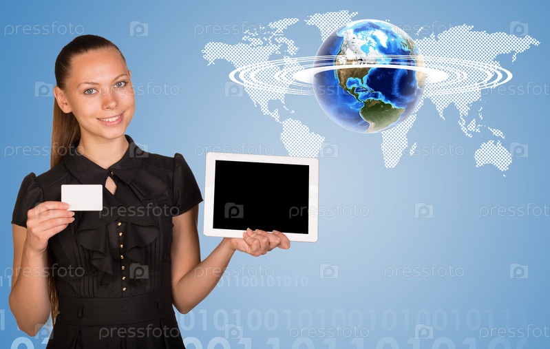 Красивая деловая женщина с визиткой и планшетом