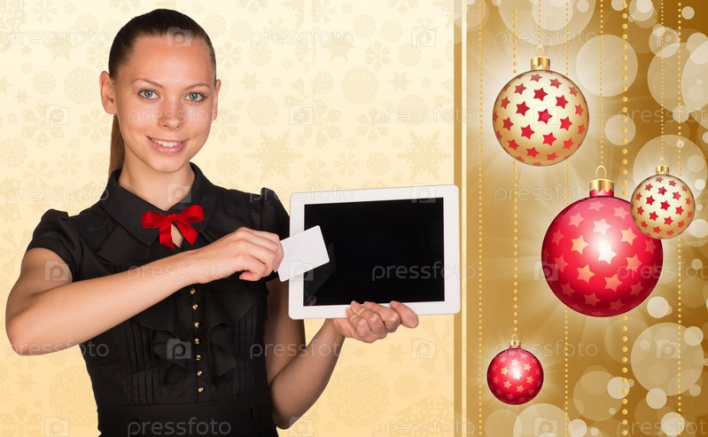 Красивая деловая женщина с визиткой и планшетом