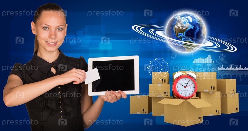 Красивая деловая женщина с визиткой и планшетом