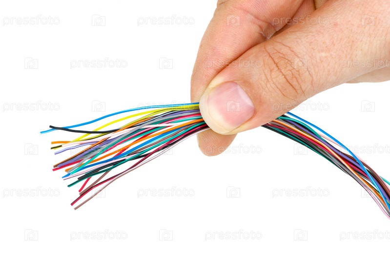 Рука держит пучок разноцветных проводов, изолированы на белом фоне