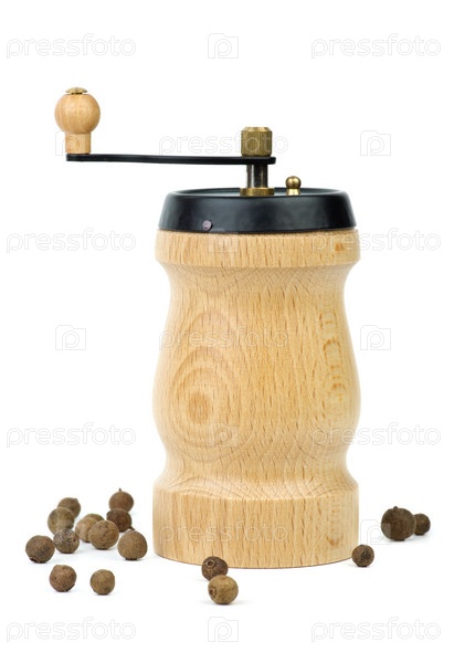 Ручная мельничка для специй и несколько зерен черного перца на белом фоне