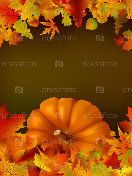 Красочные осенние листья и тыква на зеленом фоне