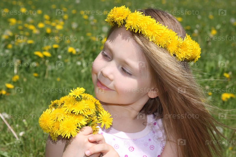 Маленькая девочка на лугу с букетом одуванчиков