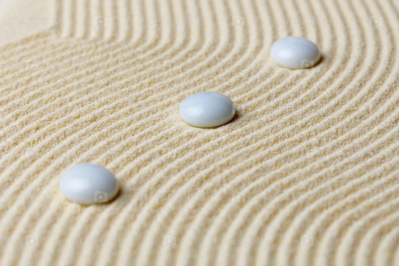 Художественная композиция из белых камней на поверхности желтого песка