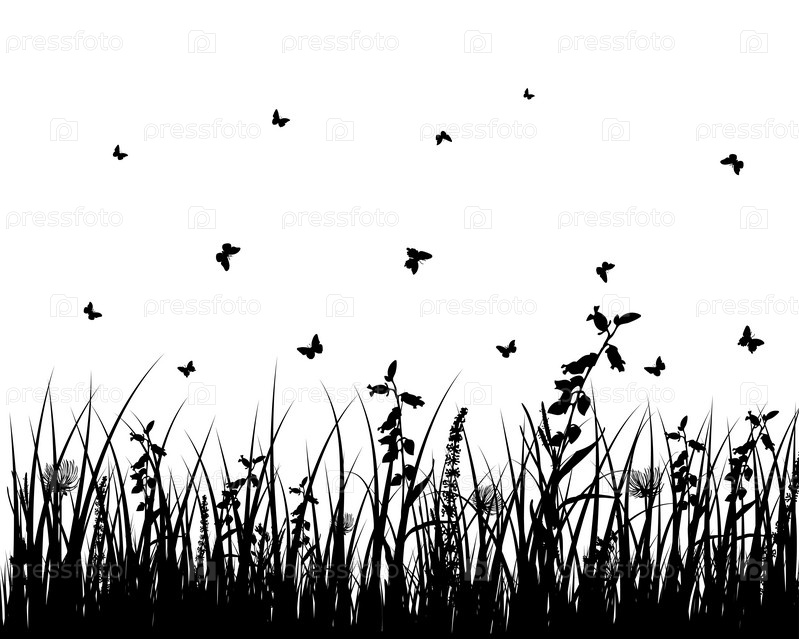 Векторный фон с травой, цветами и бабочками