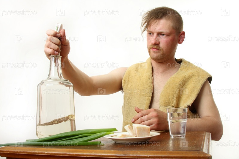 Мужчина пьет лунный спирт и имеет закуску с жиром и луком