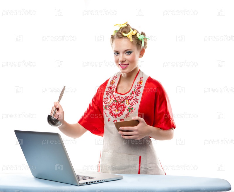 Женщина печет блины на ноутбуке