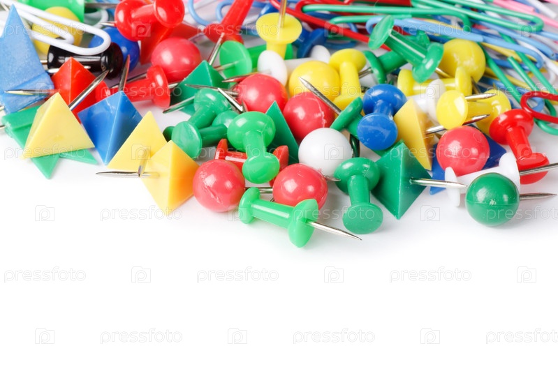 Разноцветные канцелярские кнопки на белом фоне