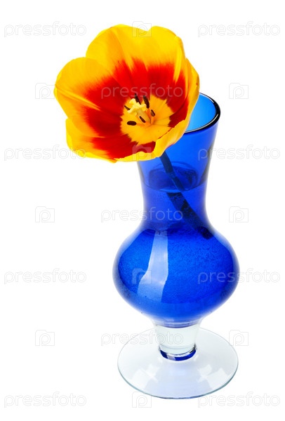Тюльпан в голубой стеклянной вазе на белом фоне