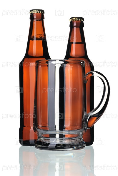 Бутылки пива и стеклянная кружка на белом фоне