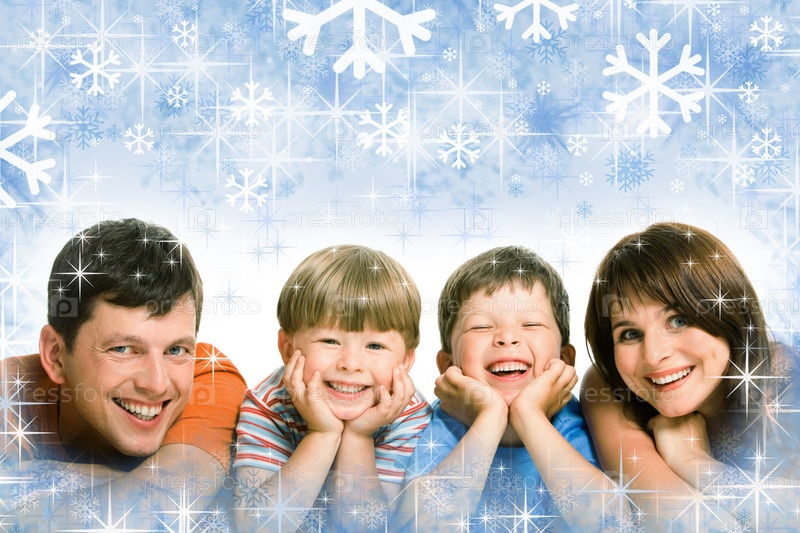 Фото улыбающейся семьи на фоне зимней снежинки