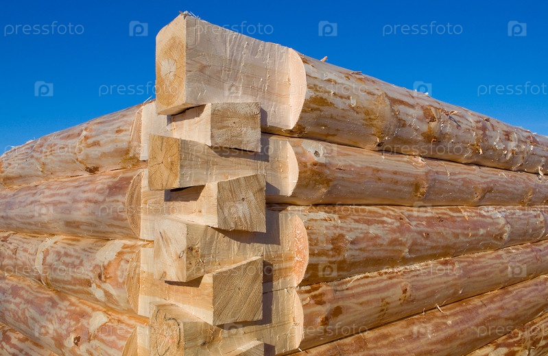 Бревенчатый сруб на фоне голубого неба