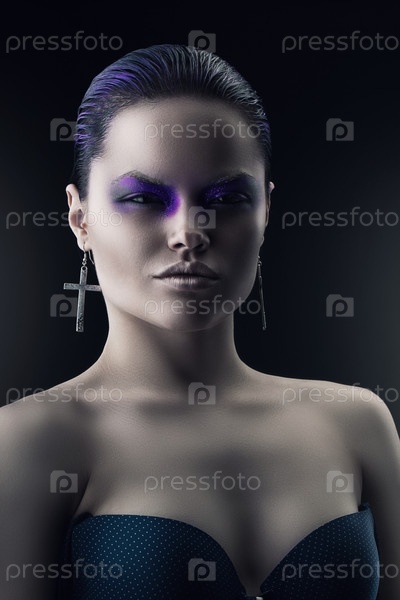 Женщина с фиолетовыми волосами на темном фоне