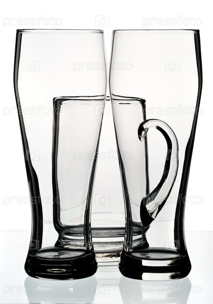 Стаканы и пивная кружка на белом фоне