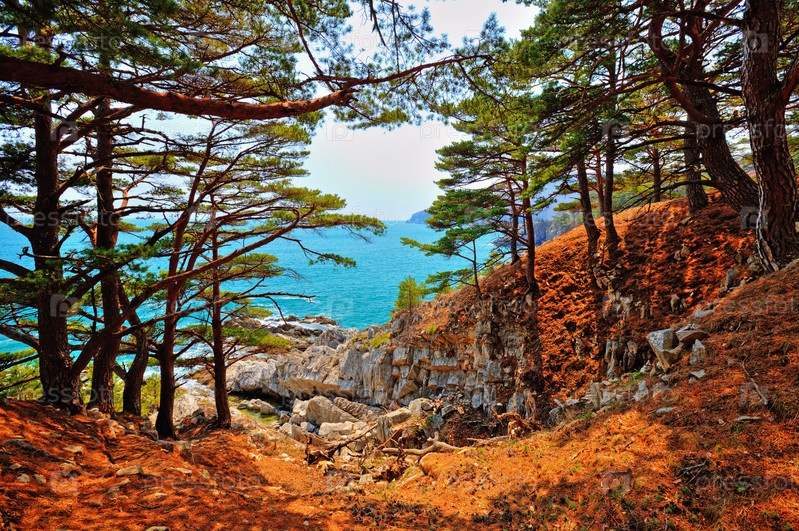 Хвойные деревья на скалистом берегу