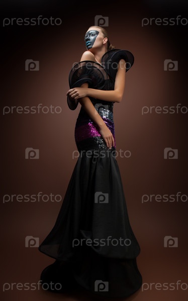 Женщина в черном платье с маской на лице