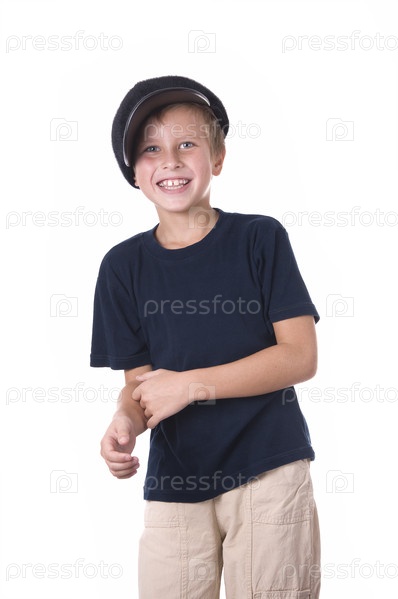 Красивый мальчик с шляпой и улыбающимся лицом над белым
