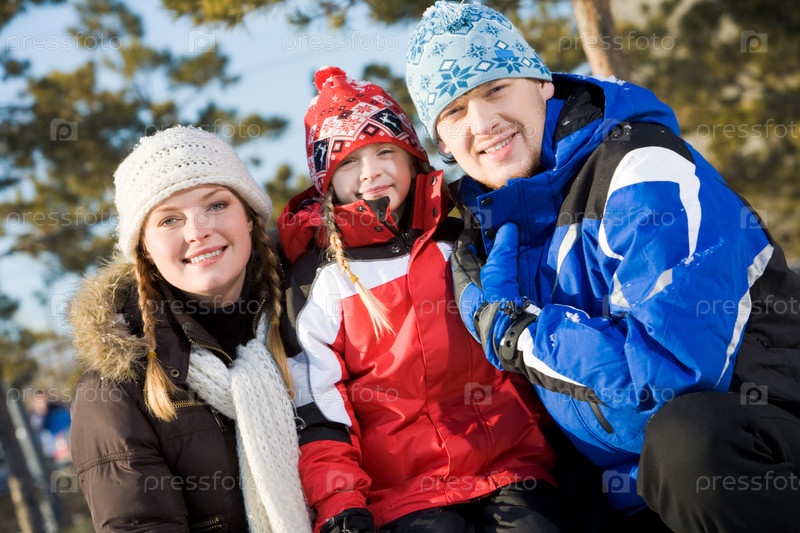Портрет женщины и мужчины с дочерью, смотрящей на камеру снаружи