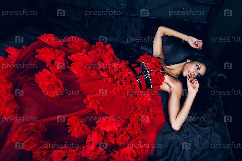 Женщина в красном платье на кровати
