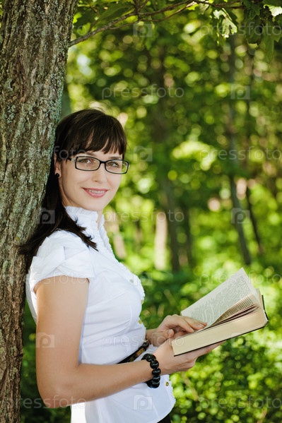 Молодая женщина читает книгу на природе