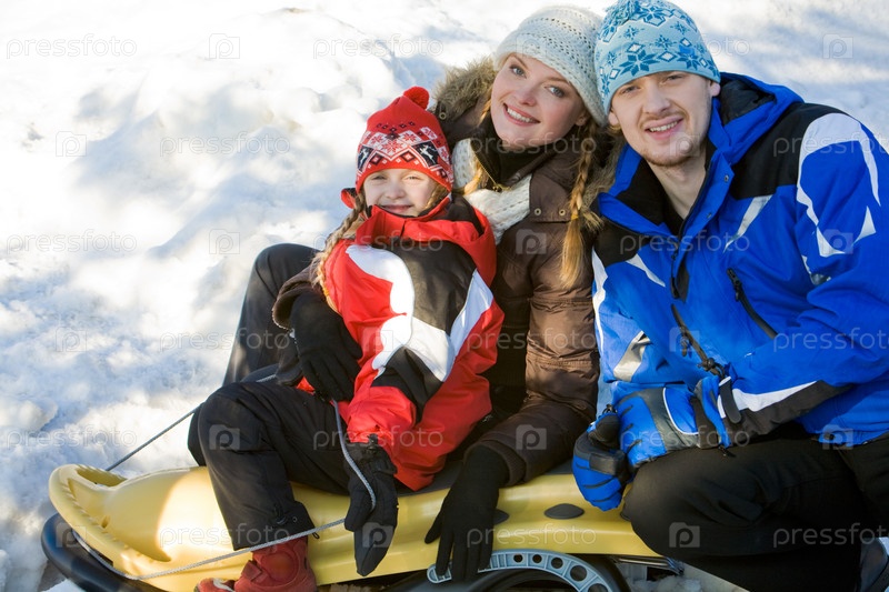 Портрет спортивной семьи, сидящей вместе на санях