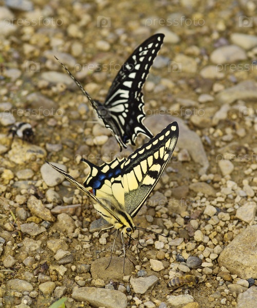 Желто-черные бабочки и пчела на земле