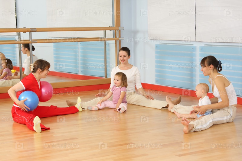 Мать и ребенок занимаются с инструктором в спортивном зале