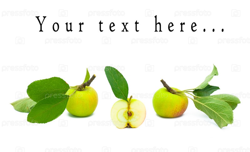 Три красивых спелых яблока с листьями на белом фоне
