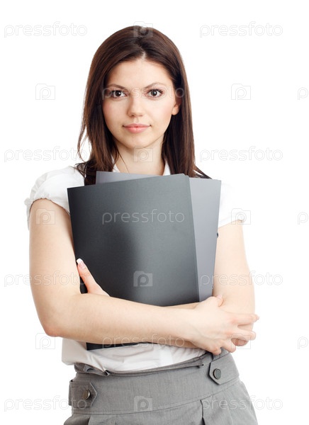 Красивая деловая женщина с папками в руках. Белый фон
