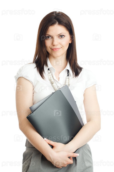 Красивая деловая женщина с папками в руках. Белый фон