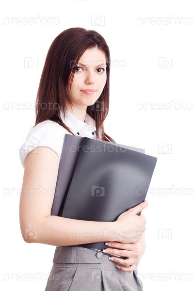 Красивая деловая женщина с папками в руках. Белый фон