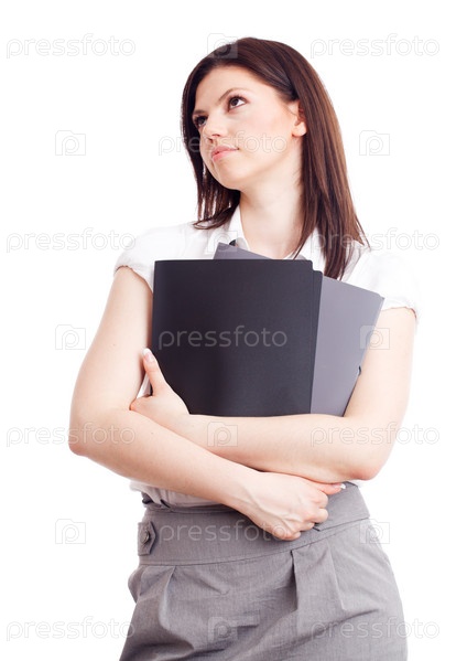 Красивая деловая леди с папками в руках, изолированная на белом фоне