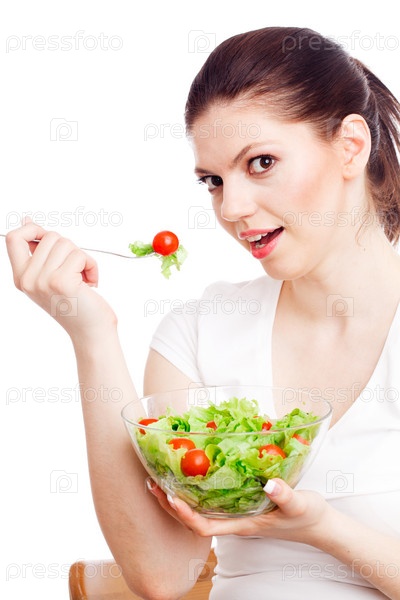Молодая женщина с чашкой зеленого салата на белом фоне