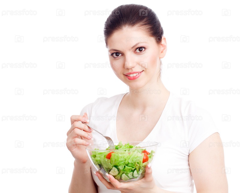 Молодая женщина ест полезный овощной салат. Белый фон