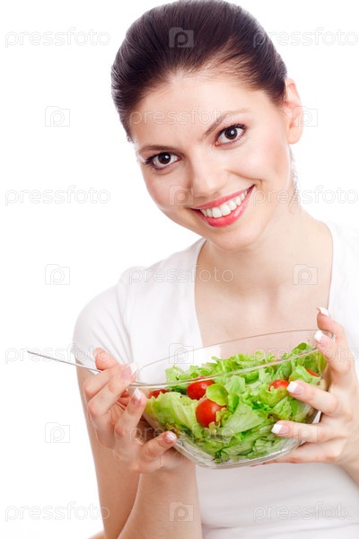 Молодая женщина ест полезный овощной салат. Белый фон